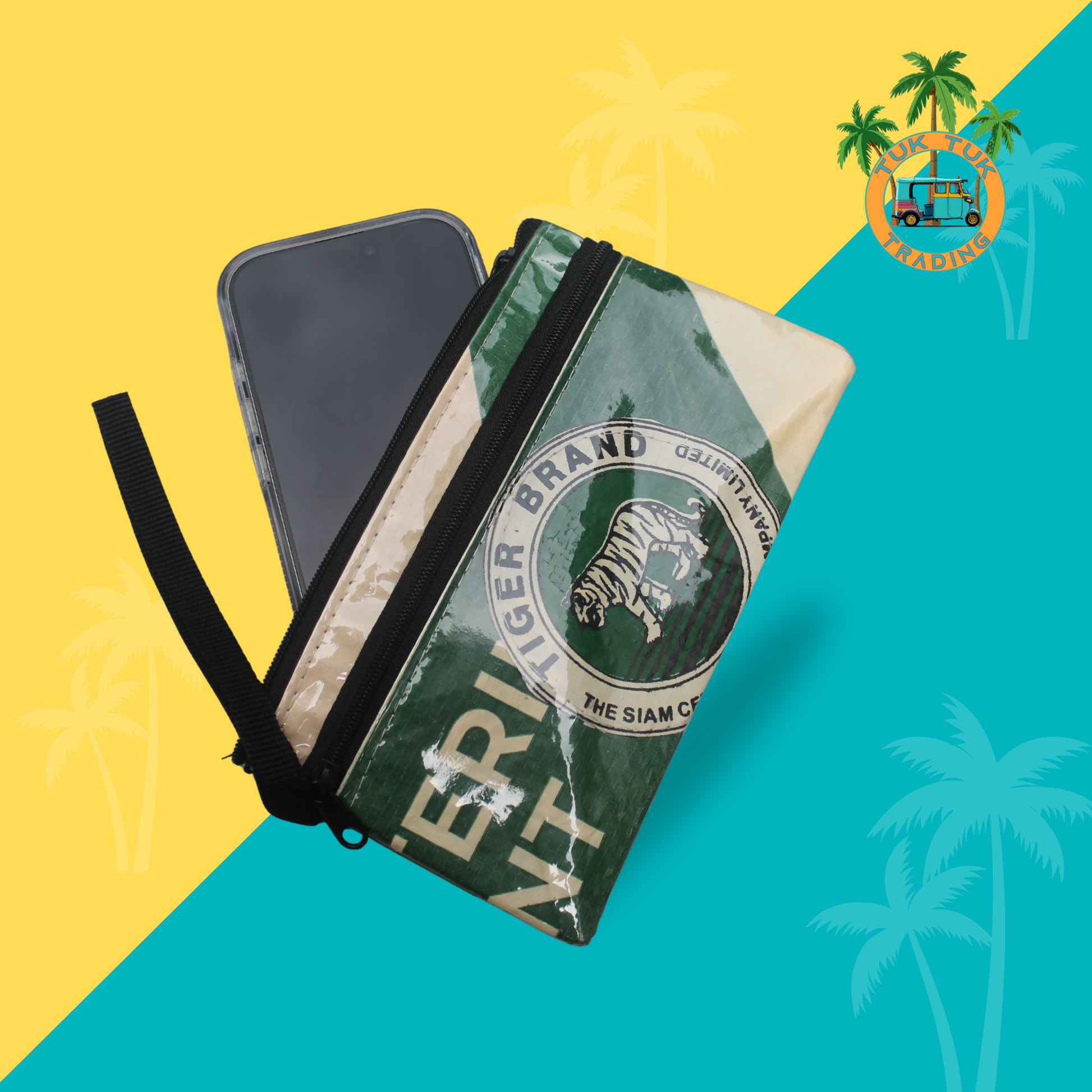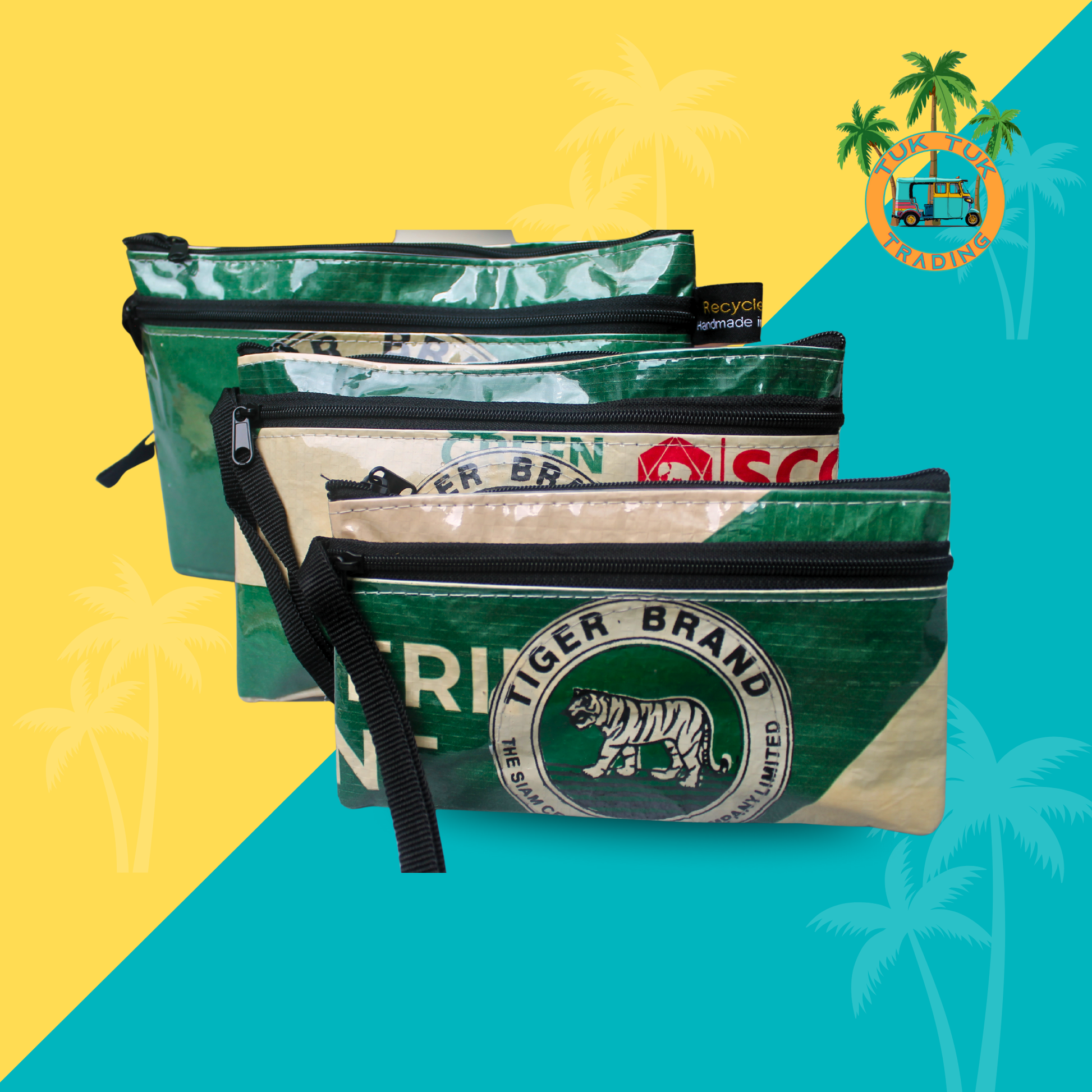 This 3 in 1 Nesting Pouch set includes three versatile bags designed to meet all your needs. The large pouch functions perfectly as a clutch or everyday bag, while the medium and small pouches are ideal for essentials like business cards and coins. Each pouch is coated with a clear protective layer to preserve the design’s quality and durability, includes a black wrist strap, a front zippered pocket, and top zippered closure. Perfect for those seeking practical elegance and efficient storage in one compact set. Made from recycled cement bags.