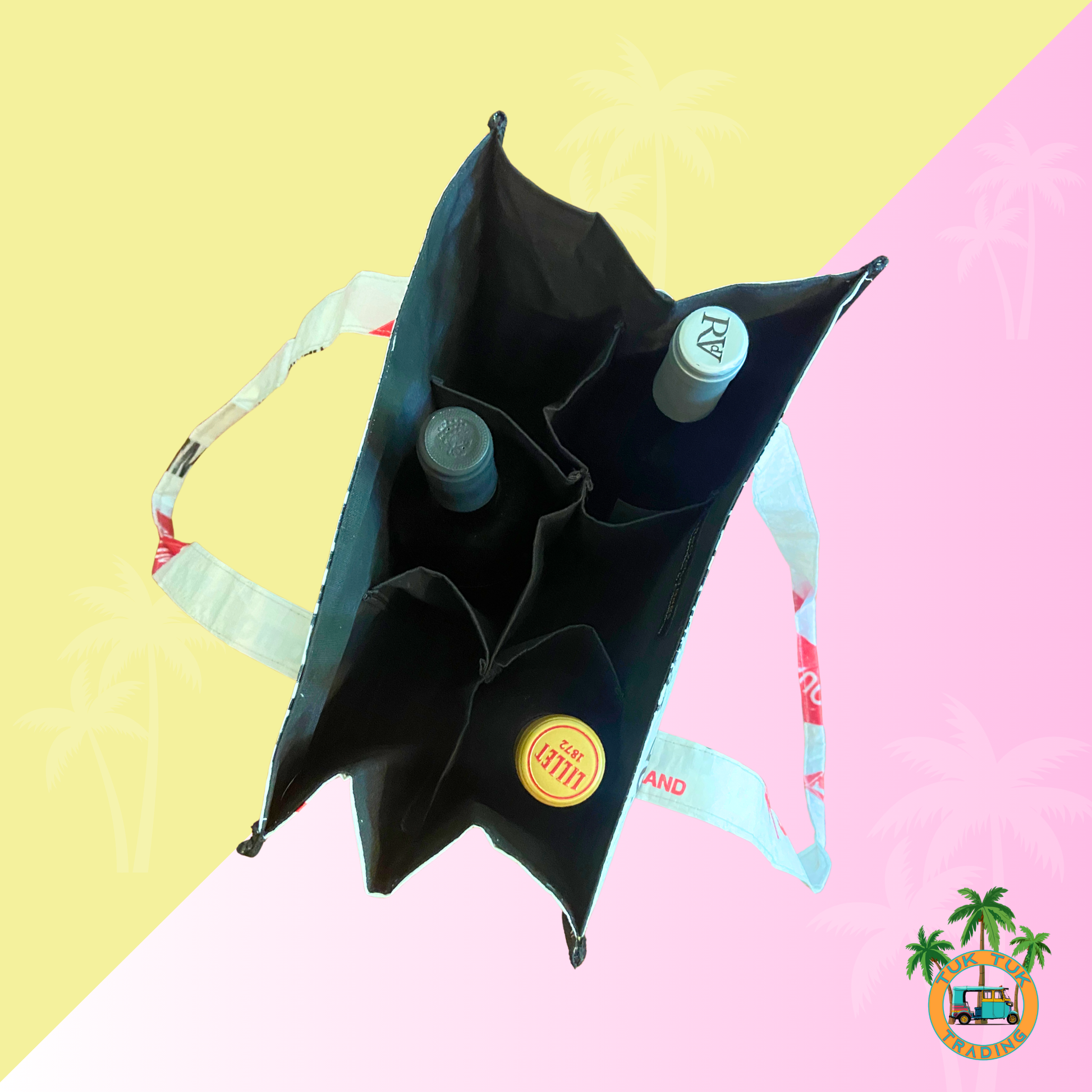 This eco-conscious Six Bottle Wine Carrier repurposes discarded cement bags into a functional tote designed to hold your favorite wines, water, or beverage of choice. An ideal presentation vessel when attending dinner parties or picnics.