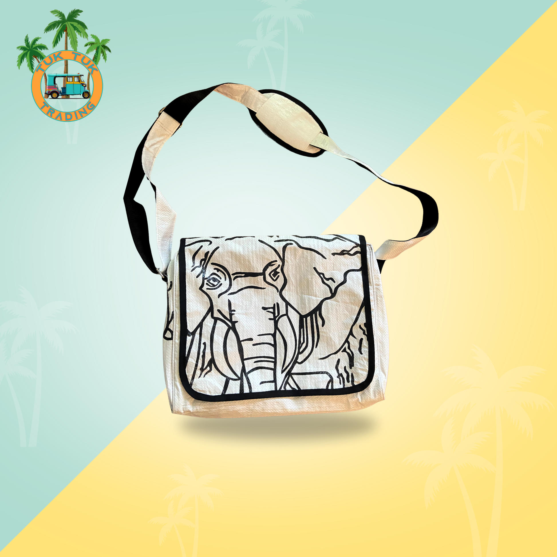 Crafted from recycled cement, rice, and fish feed bags, this spacious messenger bag goes the distance. Each bag is one of a kind and features a double magnetic closure, black padded lining, one magnetic closure exterior pocket, and one interior zippered pocket. The nylon shoulder strap has an adjustable pad. Fit your laptop, books, and all daily or travel essentials.