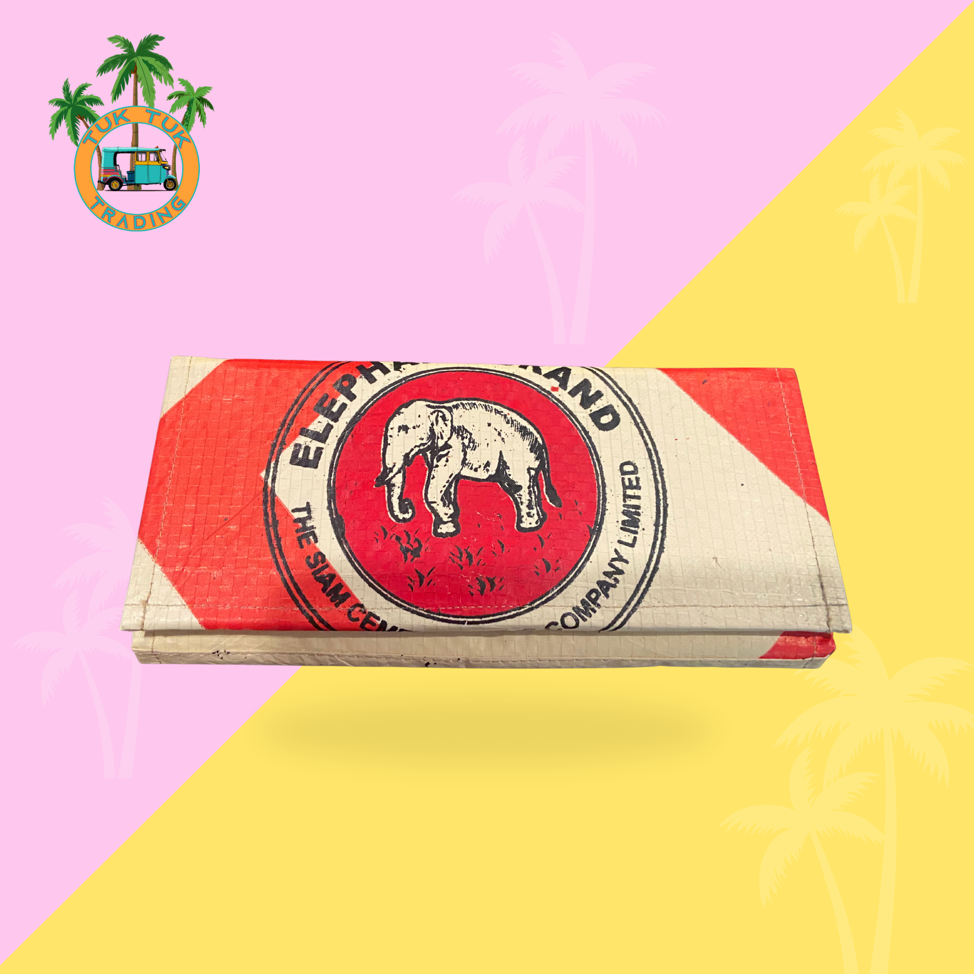 The stylish long wallet features a slim and lightweight bi-fold design with magnetic closure. Practical and spacious compartments allow you to neatly organize your cards, bills and receipts. Crafted from rice or cement bags this product is great for every day use.